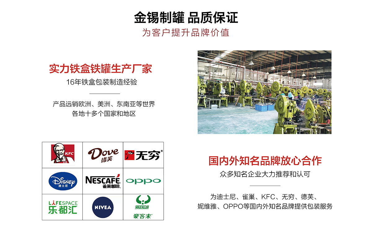 廣州市金錫五金制品有限公司成立于2016年,是已有13年生產(chǎn)經(jīng)驗的實力廠家。我廠是專業(yè)定制優(yōu)良馬口鐵盒、鐵罐、禮品盒、茶葉罐、月餅盒等金屬鐵盒包裝的制罐企業(yè),我們擁有超過6000平方米的標(biāo)準(zhǔn)現(xiàn)代化廠房及八條生產(chǎn)線。公司集產(chǎn)品研發(fā)、設(shè)計、生產(chǎn)、銷售于一體,技術(shù)優(yōu)良,實力雄厚。通過十多年的制罐經(jīng)驗,我們擁有專業(yè)的技術(shù)團(tuán)隊,嚴(yán)格的作業(yè)流程、完整的品質(zhì)保障體系、完善的銷售以及售后服務(wù)系統(tǒng)。